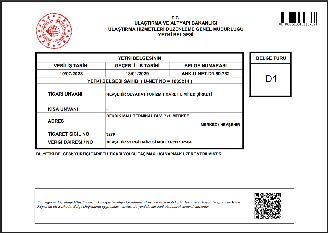 Ulaştırma ve Altyapı Bakanlığı - D1 Yetki Belgesi